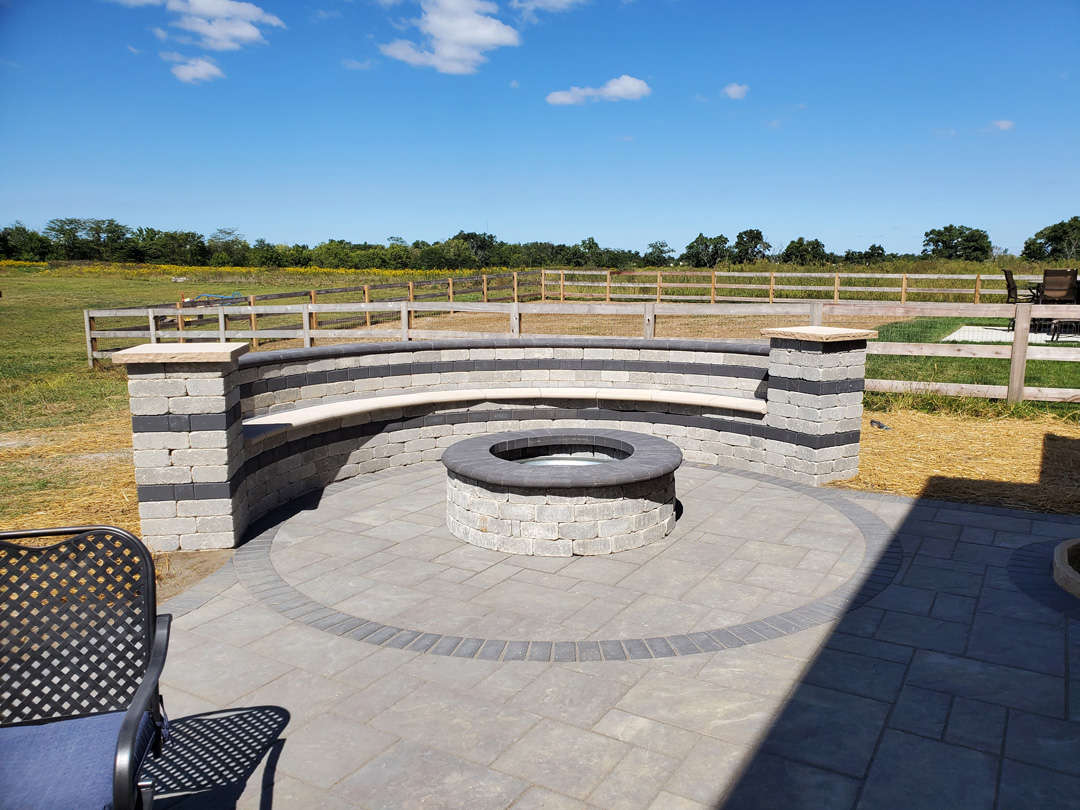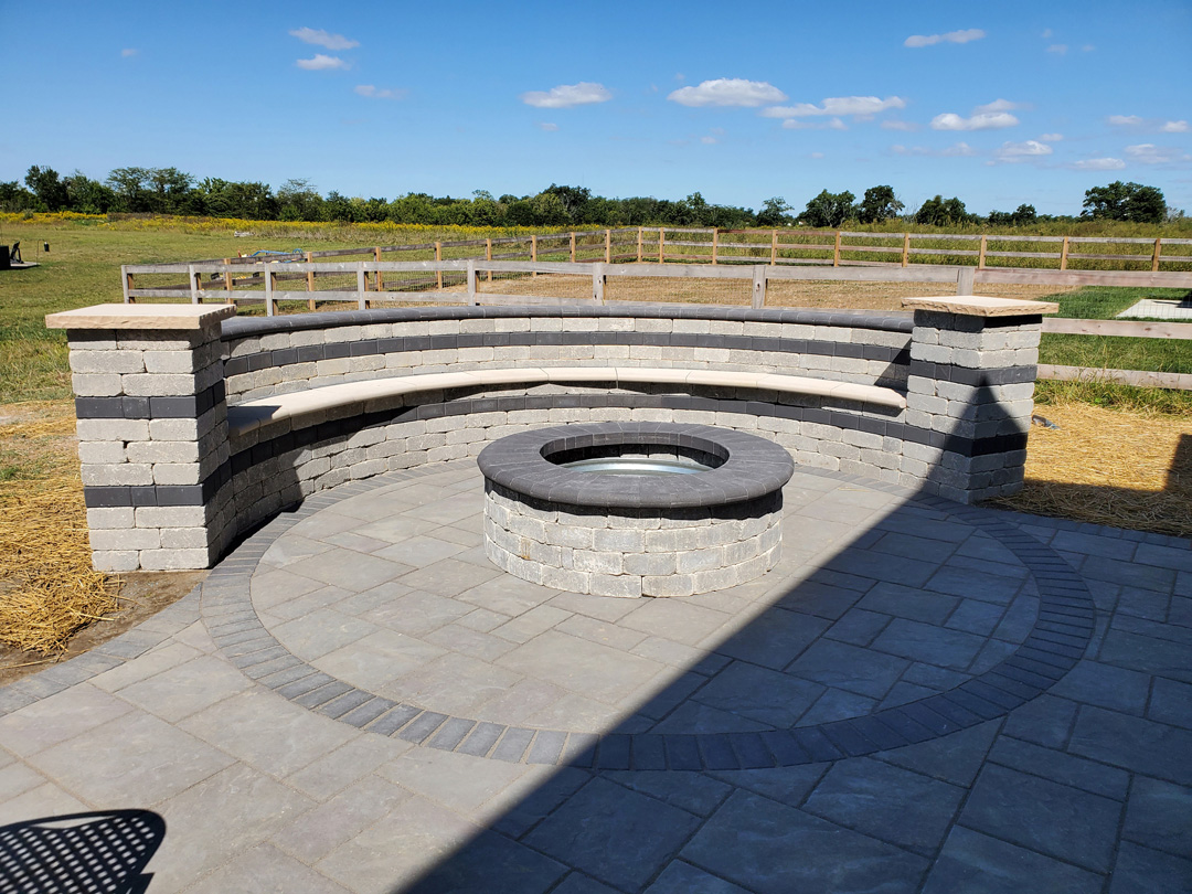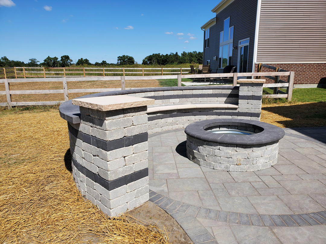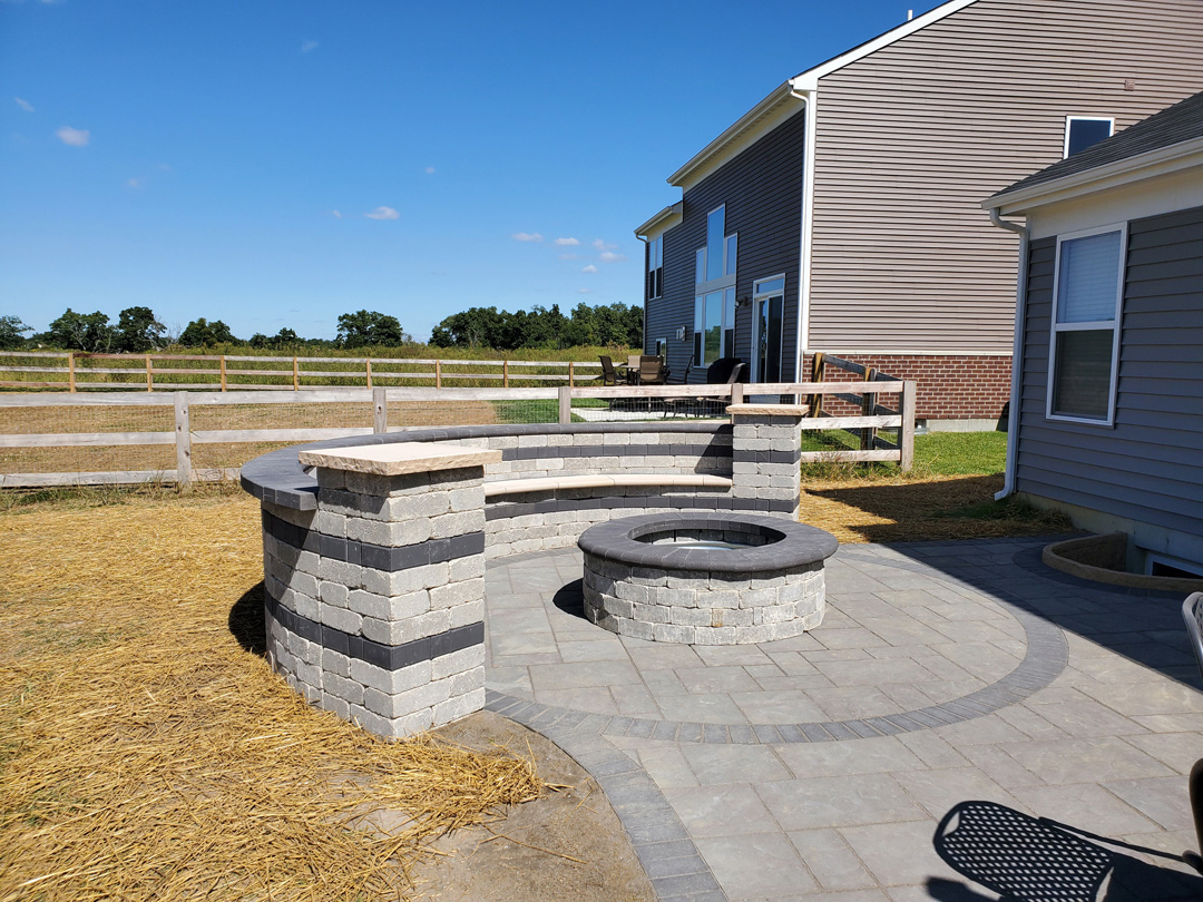 Backyard stone patio with fire feature and bench seating